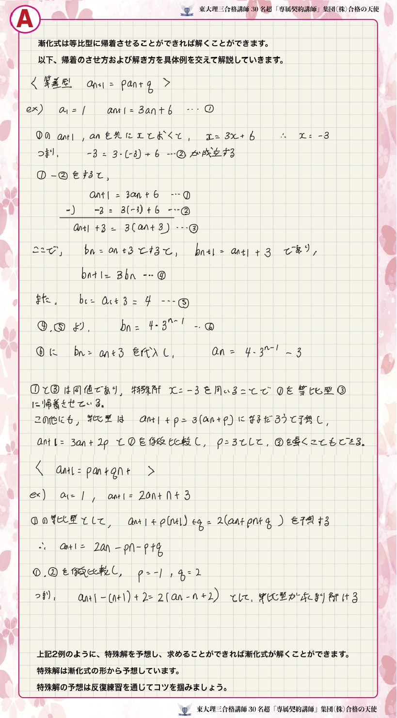 このように、模範解答には予想して数学的帰納法というのがはっきり書いてなかったので分かりにくかったのだと思います。 実際には上記のような思考過程を経ています。